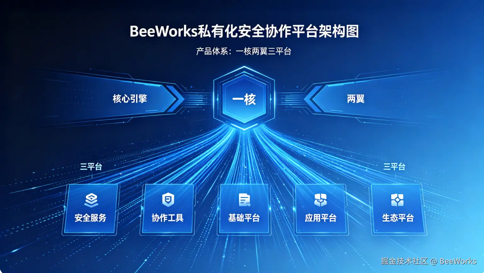 BeeWorks 秉持 "私有化安全的协作平台" 定位,以 "安全、高效、融合、开放" 为核心价值观,致力于为企业打造一个数据自主可控、能力全面覆盖、业务深度融合的数字工作空间。经过十年持续迭代,BeeWorks 已形成 "一核两翼三平台" 的完整产品体系: