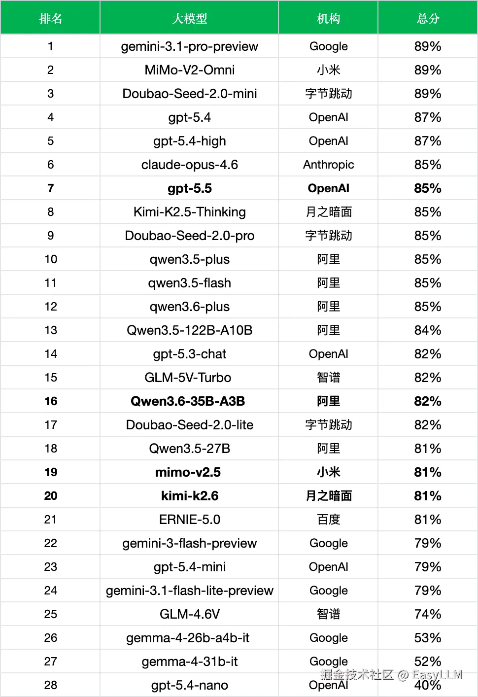在本次排行榜中,小米阵营的表现可谓“冰火两重天”。虽然同家族的 MiMo-V2-Omni 以 89% 的高分高居第二,但作为本次重点实测对象之一的 mimo-v2.5,却以 81% 的成绩滑落至第19名。