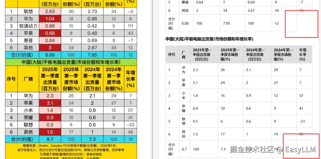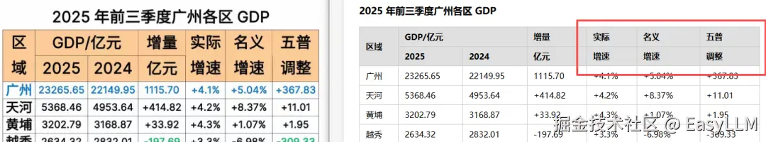 此外,它在识别复杂表格标题时出现了明显的「偷懒」倾向:标题内容部分数值被省略,甚至文字直接缺失。更严重的则是数值错误,在精密的表格还原中,一个数字的错误往往意味着整张表的作废。