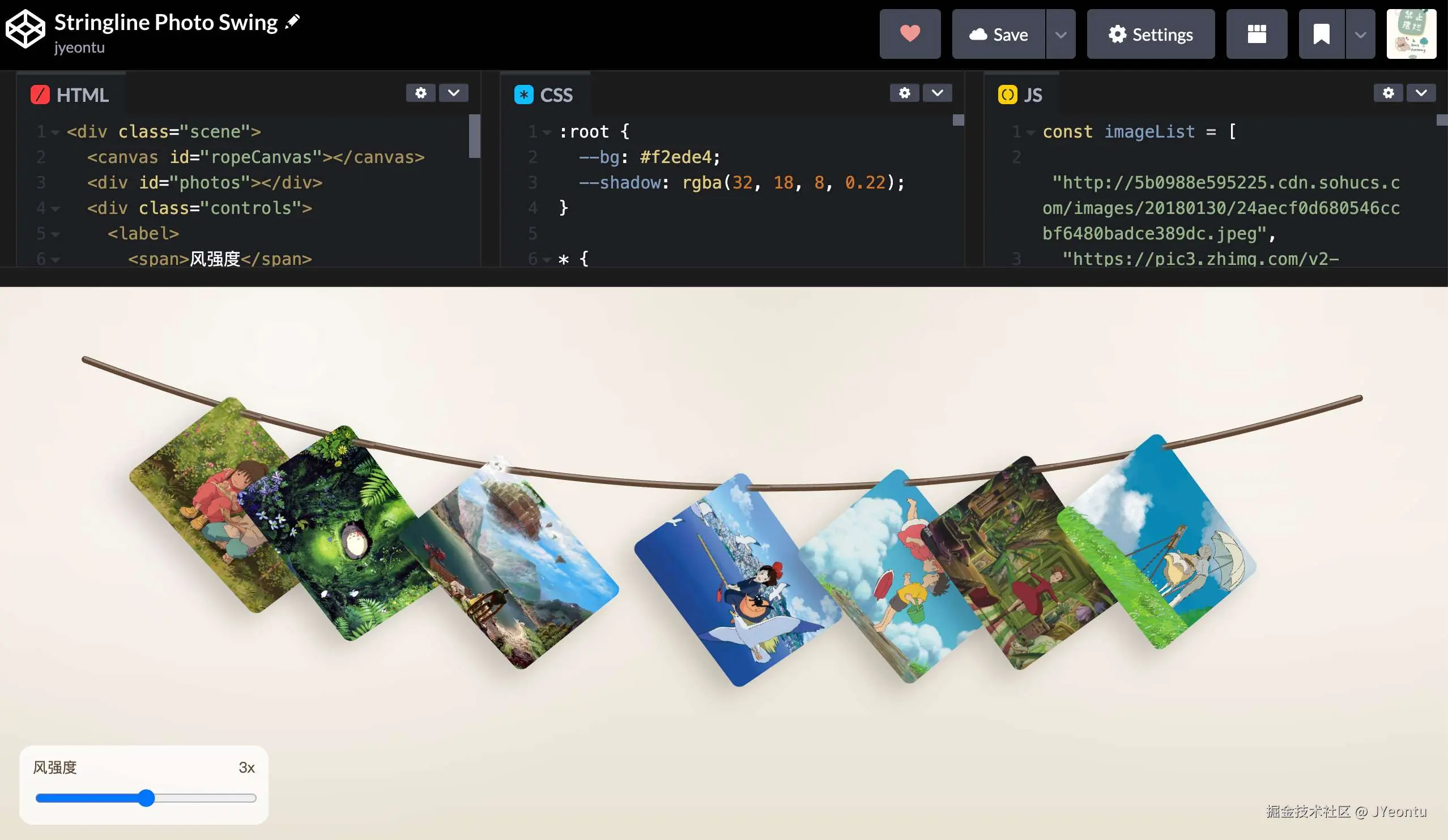 canvas#ropeCanvas:只负责画绳子。#photos:绝对定位的图片元素层。.controls:风力滑块控制区。