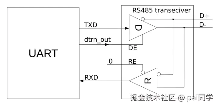 当DE被使能为1时,就使能驱动器D了,此时使用了RS485 发送模式,使用D+、D-差分信号发送数据,数据内容由TXD决定;当DE被使能为0时,就关闭驱动器D了,此时使用原本UART通讯模式,直接使用TXD发送数据。