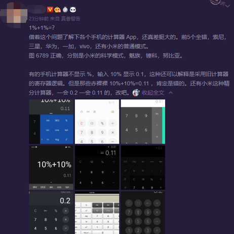 4、 三星、小米、一加这种结果都不算错,输入百分号自动将百分之转成了小数值。魅族、锤子也不算错,但是貌似对%有更高的运算优先级,这种情况一般不会自动将百分数转成小数。